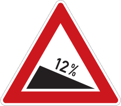 popis: upozorňuje na úsek, kde klesání pozemní komunikace přesahuje 10 % nebo kde místní podmínky činí klesání nebezpečným; vyznačen je skutečný sklon pozemní komunikace