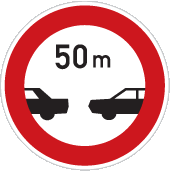 popis: zakazuje řidiči motorového vozidla jízdu za motorovým vozidlem jedoucím před ním ve vzdálenosti menší než vyznačené na značce